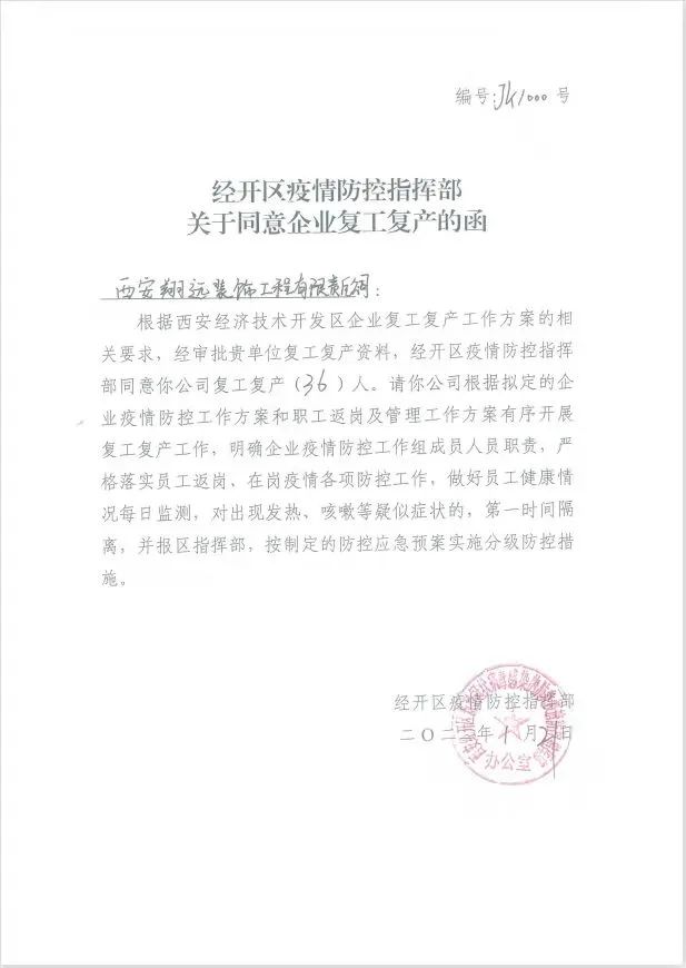 西安翔遠『復工通知』