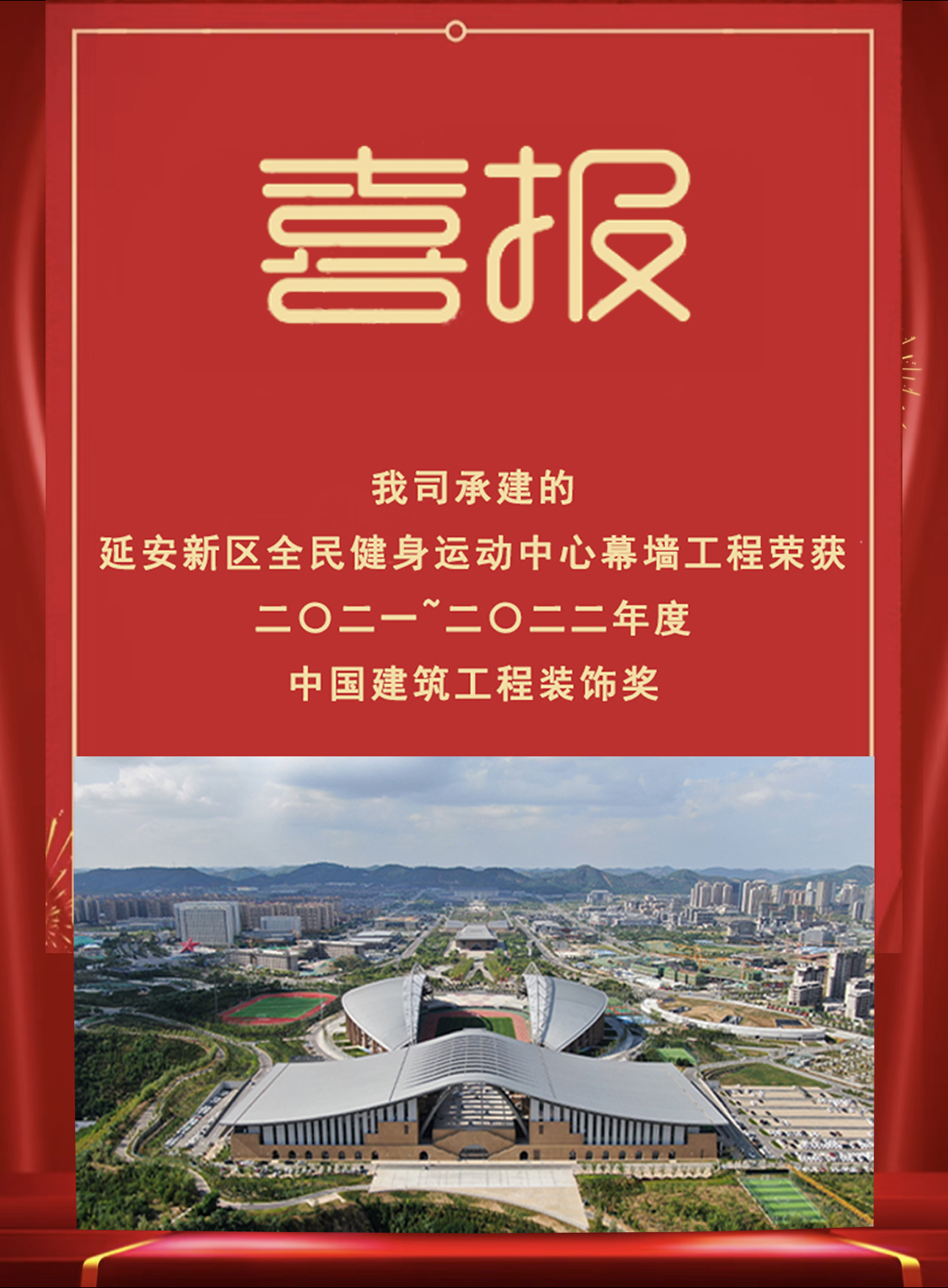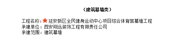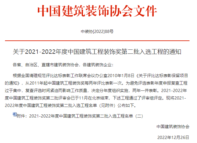 2022年12月26日,中國建筑裝飾協會發文《關于2021-2022年度中國建筑工程裝飾獎第二批入選工程名單》的通知,其中我司承建的延安新區全民健身運動中心項目綜合體育館幕墻工程獲此殊榮。