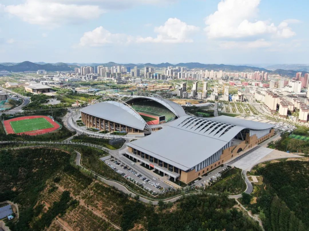 延安全民健身運動中心項目呼應延安新區城市設計中軸線序列對稱打開的總體格局,巧妙利用地形現狀的特點,“順勢而為”。外觀設計高度融合延安文化特點,窯洞、拱元素、黃土的元素與建筑設計巧妙結合,具有地域特色,建筑以陜北黃為主色調,其他色彩點綴。體育館結合建筑設計造型語言的需要,因勢巧借,引入創新的勁性索結構,金屬屋面靈動飄逸,與外立面混凝土掛板相映襯,展現延安傳統與現代科技之美。體育場采用拱桁架、單向鋼梁結構,采光帶即是結構體系,又是功能需要。立面造型即是結構功能,又是延安本土元素。整個項目外立面幕墻效果造型厚重,在符合當地特色的前提下又極具現代感。